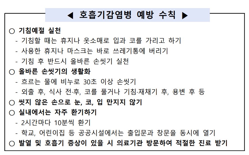 호흡기감염병 예방을 위해서는 ▲기침예절 실천 ▲올바른 손씻기의 생활화 ▲씻지 않은 손으로 눈, 코, 입 만지지 않기 ▲실내에서는 자주 환기 ▲발열 및 호흡기 증상 발생 시 의료기관 방문 진료 등의 수칙을 준수하는 것이 중요하다.