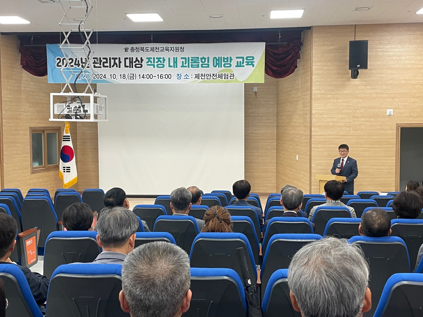 2024년 10월 18일, 제천교육지원청(교육장 강성권)은 안전체험관 오리엔테이션실에서 관내 교(원)감 및 행정실장 84명을 대상으로 직장 내 괴롭힘 근절을 위한 예방 교육을 실시했다.