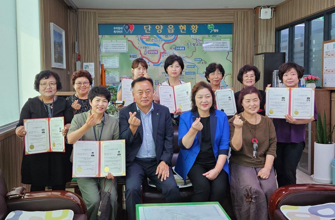 이점순 단양읍 주민자치위원장은 “수강생분들이 수업에 열심히 참여하시고 노력하신 만큼 좋은 성과를 거두신 것을 보니 기쁘다.”며 “자격증을 취득한 수강생분들이 우리 지역 에서 어르신들에게 행복을 전하는 강사로 열심히 해 주시기 바란다.”고 말했다.