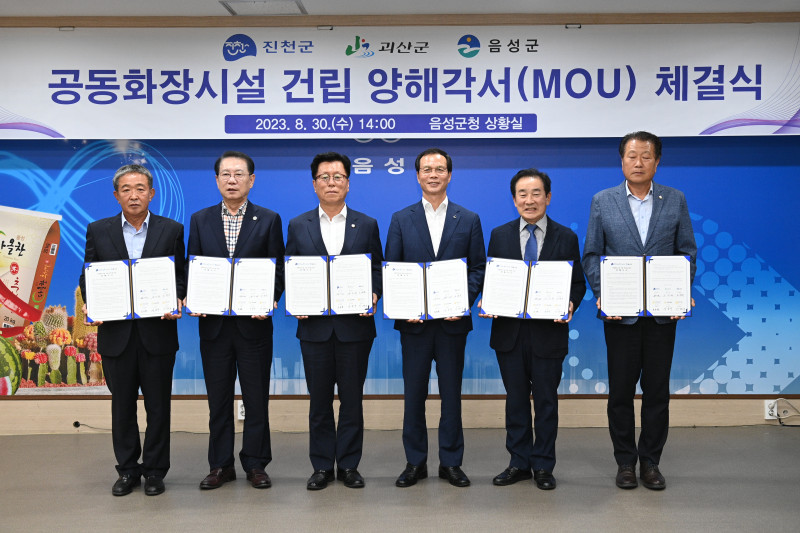이날 체결식은 송기섭 진천군수, 장동현 진천군의회 의장, 송인헌 괴산군수, 신송규 괴산군의회 의장, 조병옥 음성군수, 안해성 음성군의회 의장이 참석해 공동화장시설 건립에 대한 상호협력 및 추진 방향에 대한 의견을 모았다.