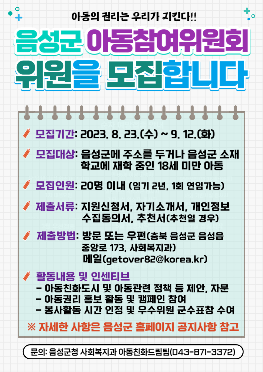 음성군(군수 조병옥)은 아동친화도시 조성의 일환으로 아동의 의견을 정책에 반영하고 아동의 권익증진을 도모하기 위한 2023년 아동참여위원회 위원을 공개 모집한다고 24일 밝혔다.