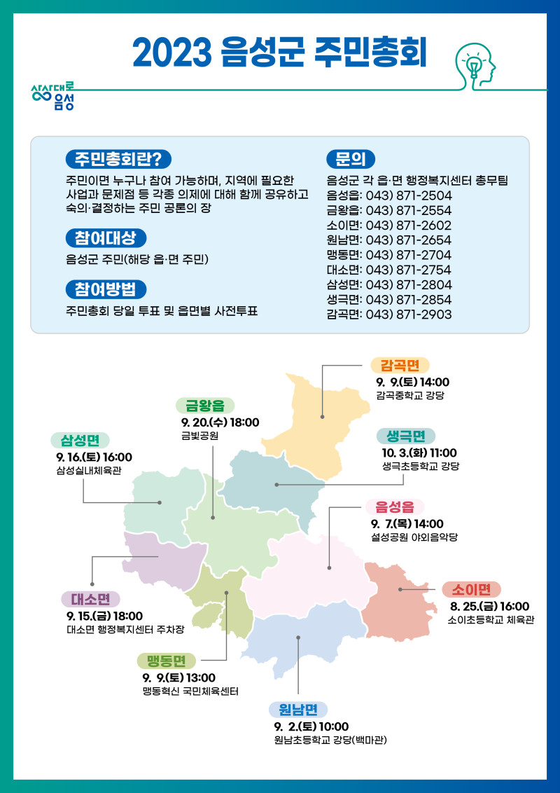 음성군(군수 조병옥) 25일 소이면 주민총회를 시작으로, 10월 3일 생극면 주민총회까지 9개 읍·면에서 각 읍·면 주민자치회 주관으로 주민총회를 개최한다고 밝혔다.