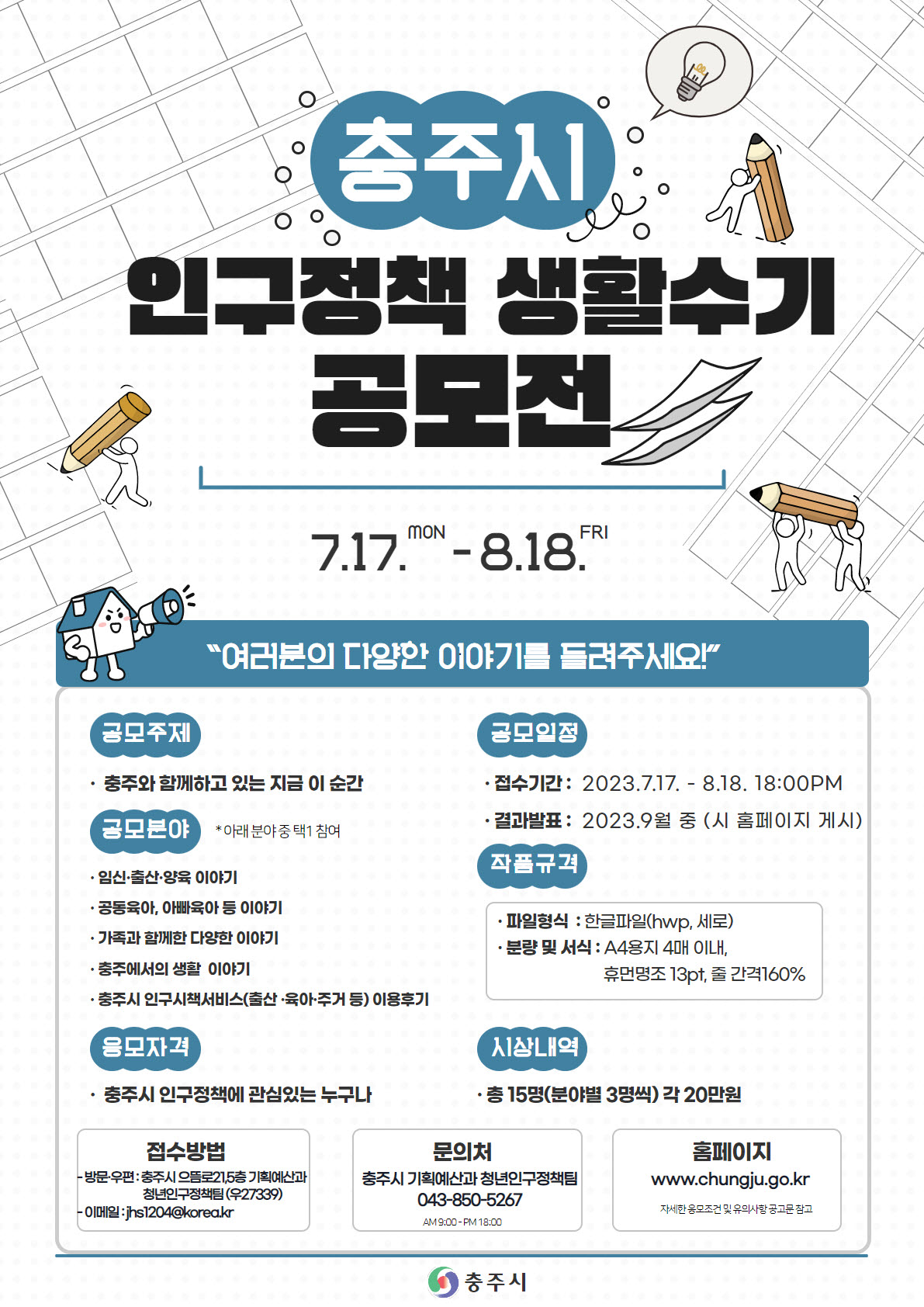 충주시는 결혼‧출산 및 가족생활에 대한 긍정적 가치관을 형성하고 인구정책 및 인구문제에 대한 시민들의 지속적인 관심도를 높이기 위해 ‘2023 충주시 인구정책 생활수기 공모전’을 개최한다.