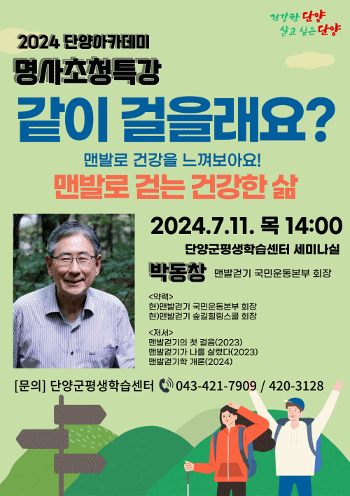 박동창 맨발걷기 국민운동본부 회장 초청, ‘맨발로 걷는 건강한 삶’강연-충북 단양군이 오는11일 오후2시 단양군평생학습센터에서2024단양아카데미 명사 초청 특강을 개최한다.군은 이…