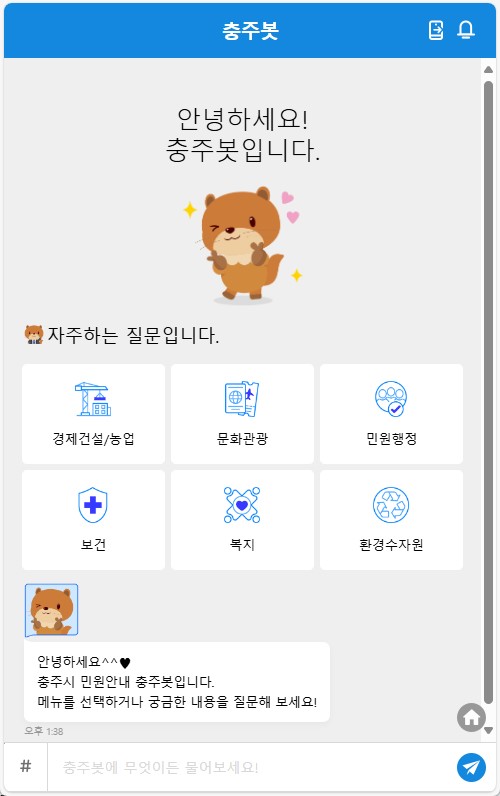 충주봇은 충주시가 지난 2월 한국지능정보사회진흥원으로부터 공공 SaaS(클라우드) 이용지원 기관에 선정되어 5월부터 민간 클라우드 방식으로 서비스하고 있는 홈페이지 내 대화형 민원 안내 서비스이다.