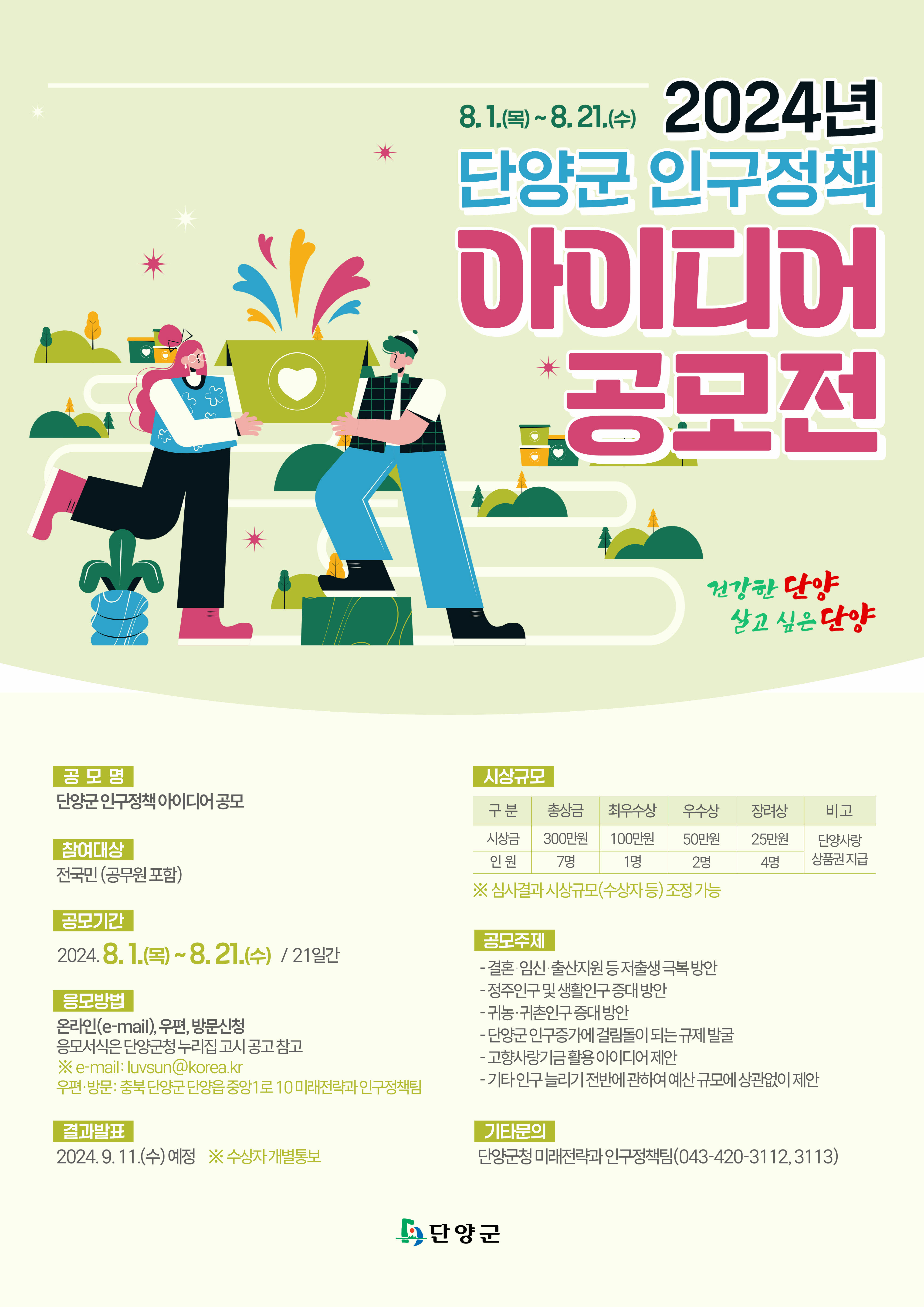 공모전은 단양군 인구정책에 관심이 있는 누구나 참여가 가능하다.