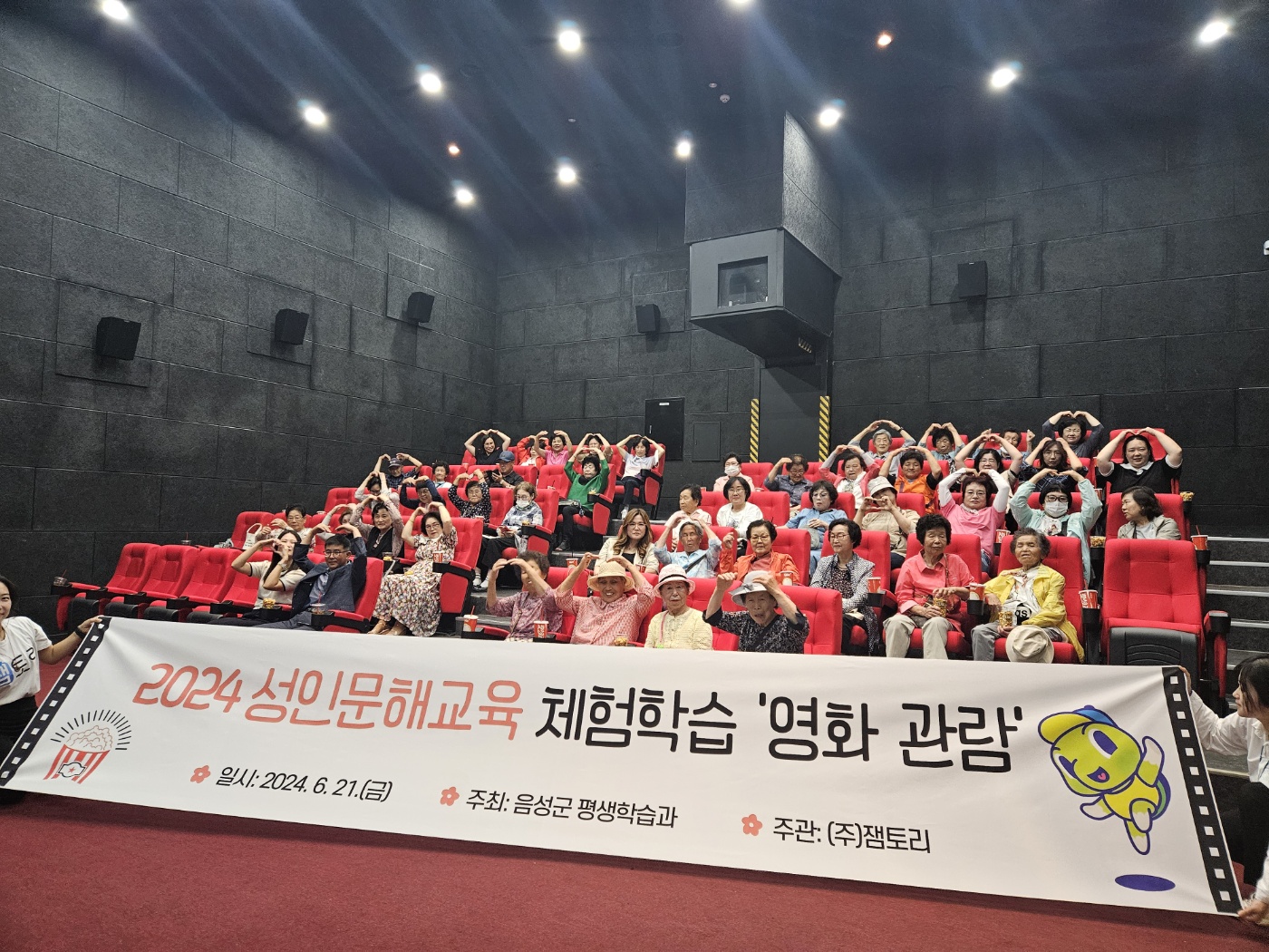 이날 성인문해교육 체험학습에는 금빛·설성평생학습관 초등학력인정, 한글교실, 검정고시 학습자와 찾아가는 문해교실 5개소 학습자들이 함께해 영화관람을 했다.