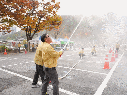 훈련은 오후 2시 연막탄과 연무기 등으로 화재발생 상황을 시작으로 재난안전단말기를 이용해 119에 신고, 화재경보기 작동, 대피방송 등을 통한 상황전파, 전직원 및 민원인 인명대피, 부상자 구조 후 심폐소생술 등 응급처치, 소화기·소화전 사용 초기진화, 소방출동, 소화기 사용법, 심폐소생술 등 국민행동요령 교육 순으로 진행됐다.