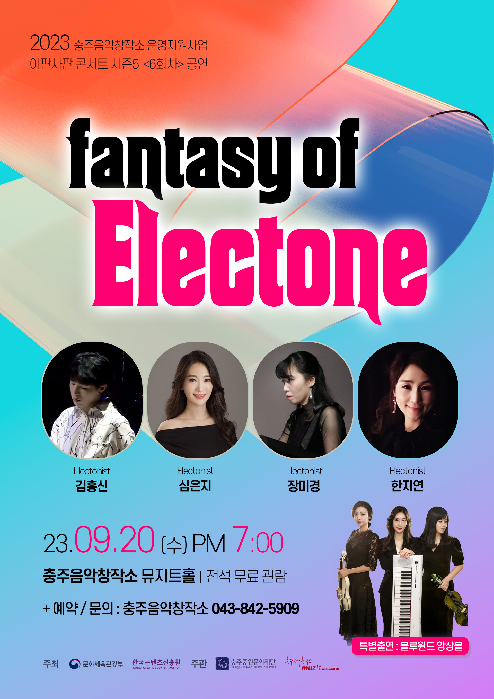 기획 공연 은 누구나 한 번쯤 들어본 음악을 엘렉토니 스트의 연주로 재해석하여 관객들의 귀를 사로잡을 예정이다. 또한, 블루윈드 앙 상블의 듀얼 악기 협연 무대와 엘렉톤 연주자 4명(장미경, 김홍신, 심은지, 한지 연)이 선보이는 합주 무대까지 준비하여 다채로운 무대를 선보일 예정이다.