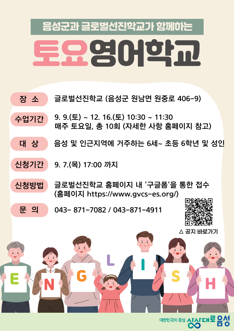 신청은 9월 7일 목요일까지 글로벌선진학교 누리집 (https://www.gvcs-es.org/)에서 할 수 있고, 음성 및 인근 지역에 거주하는 6세부터 초등 6학년 및 성인이면 누구나 신청할 수 있다.